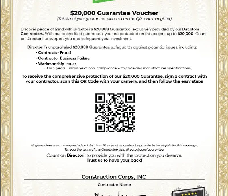 As a Directorii contractor, we have been thoroughly vetted to meet Directorii’s high standards. Directorii is committed to guarantee your project with us with a $20,000 guarantee so you can enjoy risk-free protection for your home improvement project.