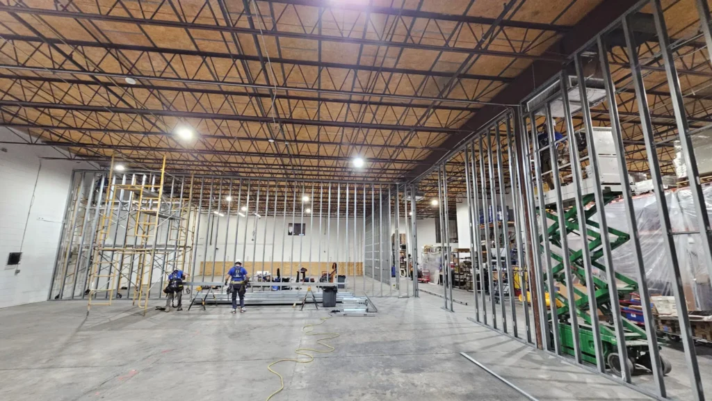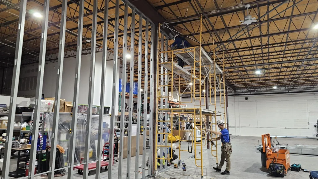 This ecommerce seller’s warehouse and office space is being subdivided and upgraded with build outs for a 2500 square foot video and recording sound studio. Sound dampening drywall and acoustic insulation are being done to help set this space up.